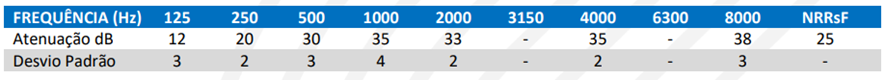 Proteção da audição do usuário, contra níveis de pressão sonora superiores aos estabelecidos na NR 15, conforme a tabela de atenuação acima.