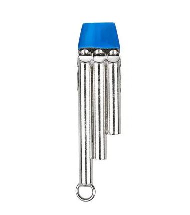 Apito Profissional trinado em Metal sem bolinha, estilo flauta. Emite 3 sons ao mesmo tempo: agudo, médio e grave. Possui biqueira de borracha. Medidas aproximadas: 10,5 cm x 2,5 cm.